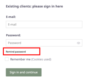 If you are a returning client, to sign in and set up your password, simply click “Remind password” in the the existing client category. You will receive an email to create a password and will then be able to continue your booking.